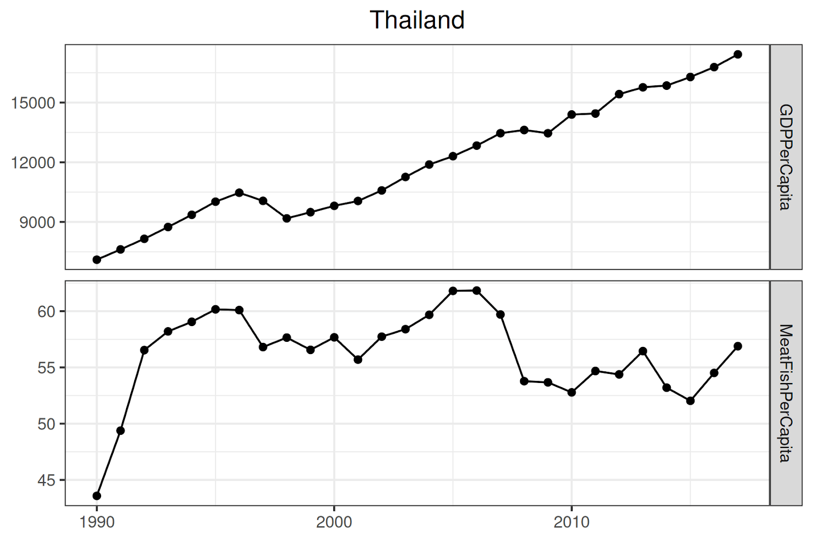 In light of this, we are still unsure what might explain the plateau in Thailand’s meat + fish consumption, so further research in this area may be beneficial.