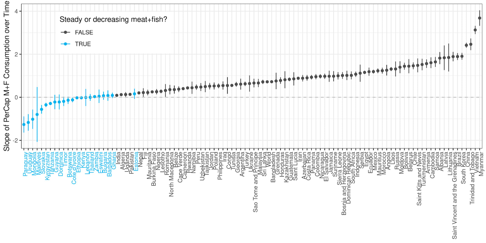 - We produced a graph showing the rate of change (slope) of meat + fish consumption per capita (and the 90% confidence interval) for each country, ordered from lowest slope to highest slope (Figure 4).