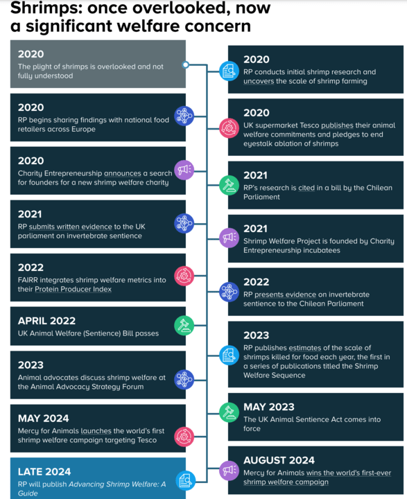 RP’s research opened up new impact pathways, influencing work on policy change, corporate commitments, and strategic shifts within the animal welfare community, alongside legitimizing shrimp welfare as an important concern. See the below graphic for more about how our shrimp welfare work helped contribute to impact in policy, legislation, non-profit entrepreneurship, and industry over time.