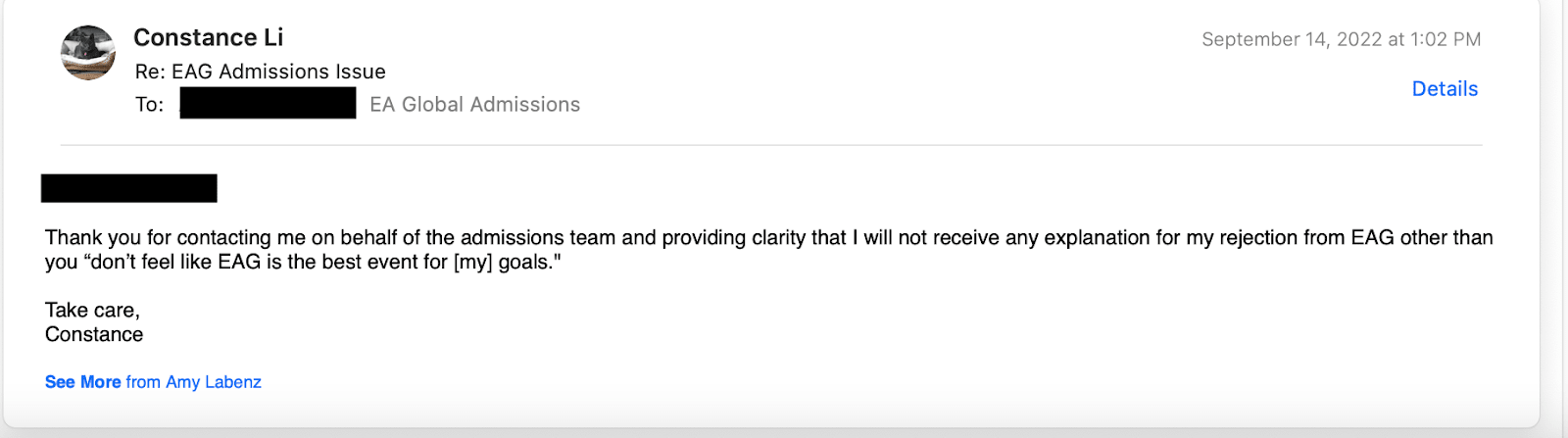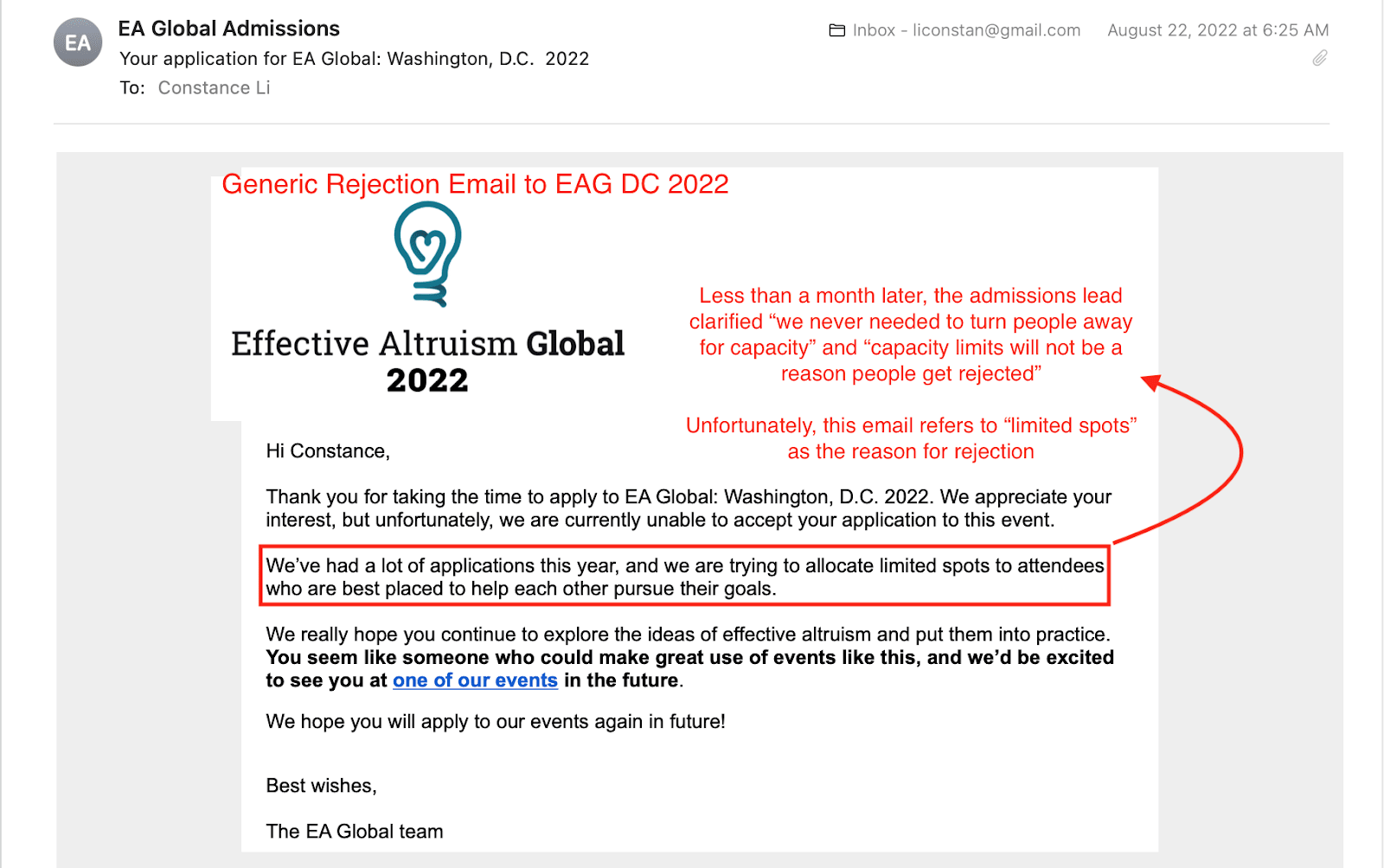 So e.g. I was accepted to EAG SF 2019 when I was in the process of deciding on a thesis topic, but rejected from EAGx Singapore 2022, most likely for not having enough relevance to Asia (I live in Australia). I felt sad that I couldn’t go, but I think it’s clear that it’s not got anything to do with a judgement of my likelihood of impact as a person.
