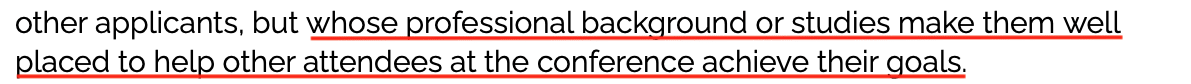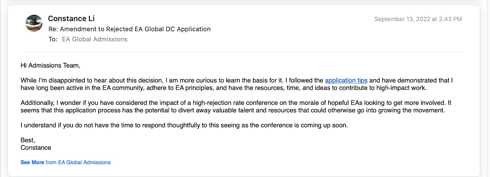 Finally feeling determined, financially equipped, and integrated enough with the EA community, I re-applied to EAG DC. I spent 2 hours working on a stronger amended application. I made sure to do my research and based my amended application on CEA’s published EAG 2022 application information and careful consideration of the insider insight about the process I got from X.