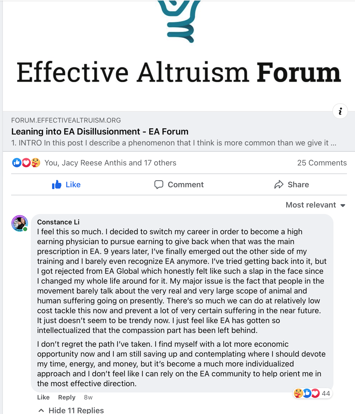 I was scrolling through facebook when I found an EA forum post about EA Disillusionment on Ruairí Donnelly’s facebook page. I had never read any EA forum posts before. Intrigued by this title, I read the post and felt like the content of it rang true to my own feelings. I proceeded to comment with my own story as a reply to the facebook post. I didn’t think much more about it and was unaware my casual comment was later turned into an anonymous “EA Blackpill” tweet that was later widely shared and used in Scott Alexander’s EA Forum post.