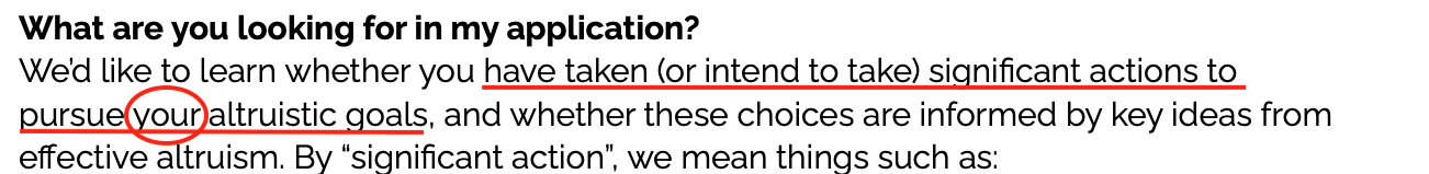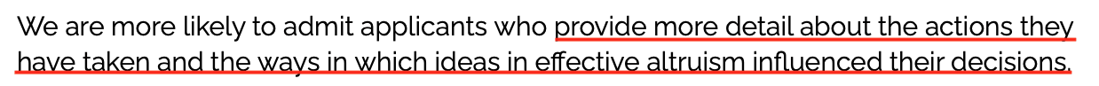 My sense was that the admissions committee wanted to connect bright, prospective EAs with direct work employers. That could be a reasonable goal, but it doesn't track the above description which sounds like its about experience acting on EA principles.
