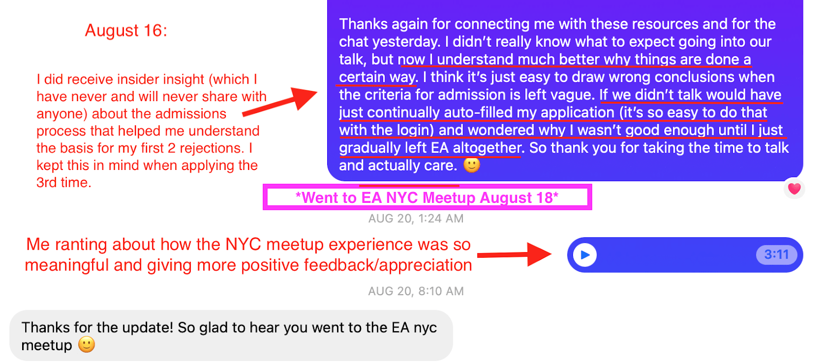 - August 15, 2022 - Had a long video chat with a sympathetic CEA staff member, “X,” who saw my post and received feedback, tips for re-integrating with the EA community, and encouragement for reapplying to EAG DC