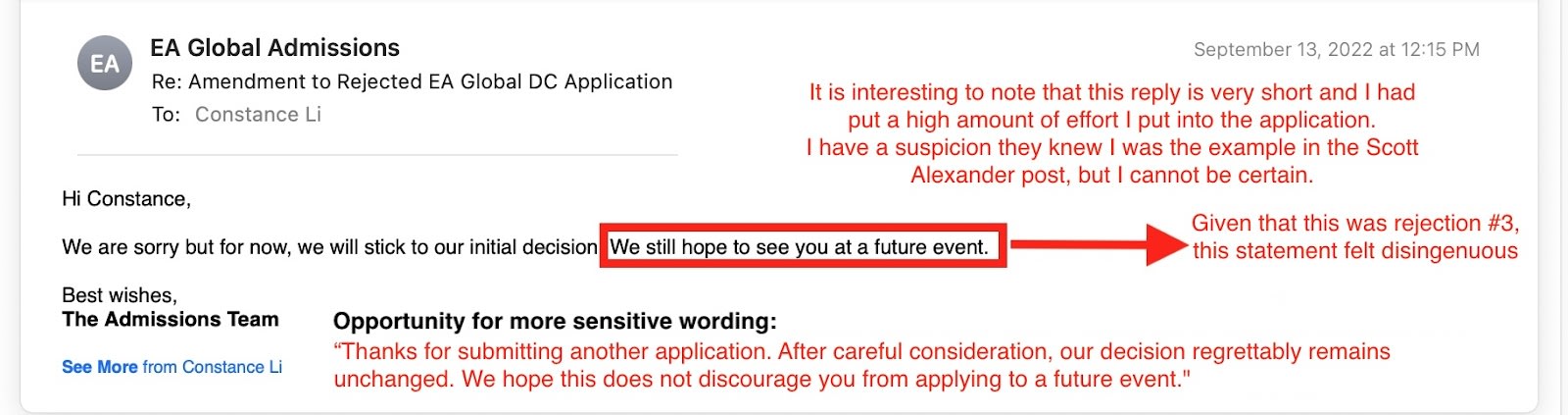 - September 12, 2022 - Had a well-connected friend personally recommend me for EAG DC, but they were quickly told my application would likely be rejected again