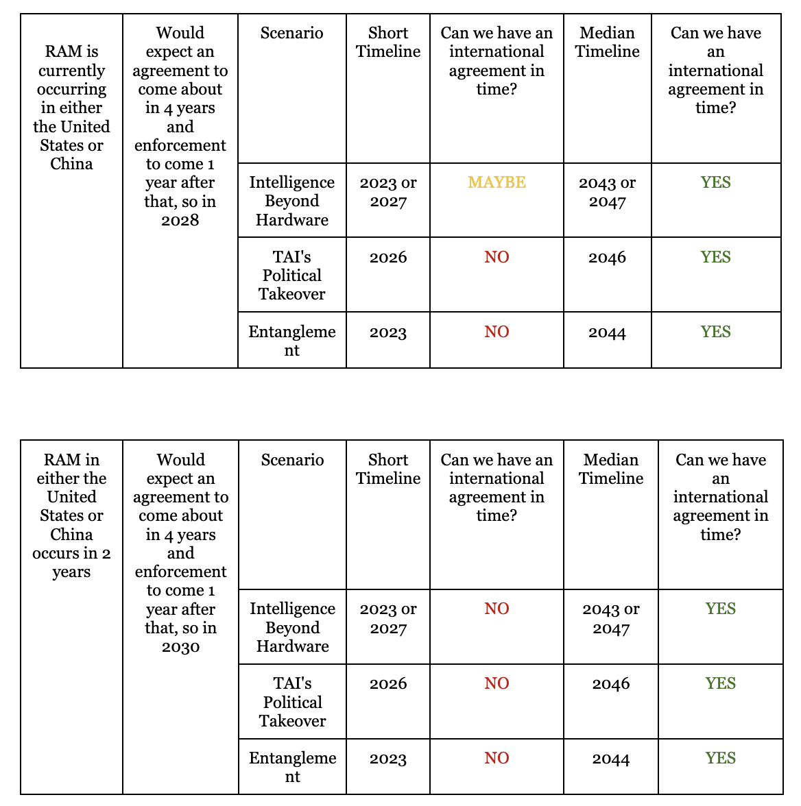 As an initial estimate, I would expect countries to act more quickly to establish an agreement if concerns about potentially catastrophic AI risks reach the RAM threshold, perhaps reaching an agreement within 1-2 years. There also appears to be a possibility of an initial agreement being made in principle within this accelerated timeframe, with details sorted out later.