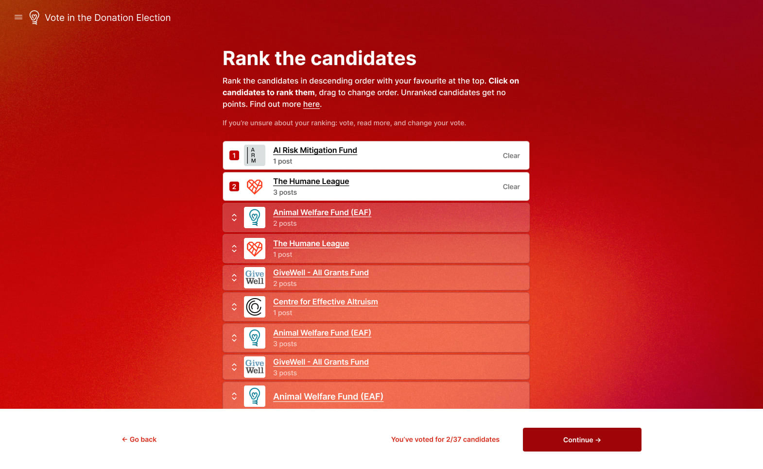 - Tactical voting: Your vote doesn’t have to represent your true preference order. Perhaps you see that the candidate that is currently in 3rd place seems a lot worse to you than the candidate that is in 4th. In that case, you are free to change your vote to put the 4th place candidate in 1st (even if they wouldn’t be your top choice).