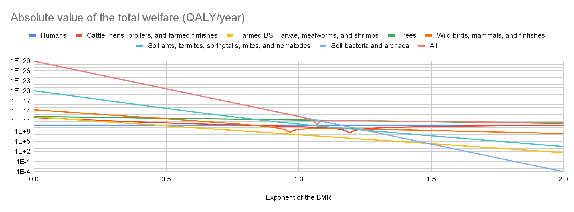 I guess exponents of the BMR from 0.5 to 1.5 lead to reasonable best guesses under my assumption that individual welfare per fully-healthy-organism-year is proportional to “BMR at 25 ºC of the organisms”^“exponent of the BMR”. I do not know whether this is the case, which means my results underestimate uncertainty, but I do not rule it out. So I conclude any of the following are reasonable views, although not the only ones (I use |x| for the absolute value of the total welfare of x, and << for “is smaller than 10 % of”). For an exponent of: