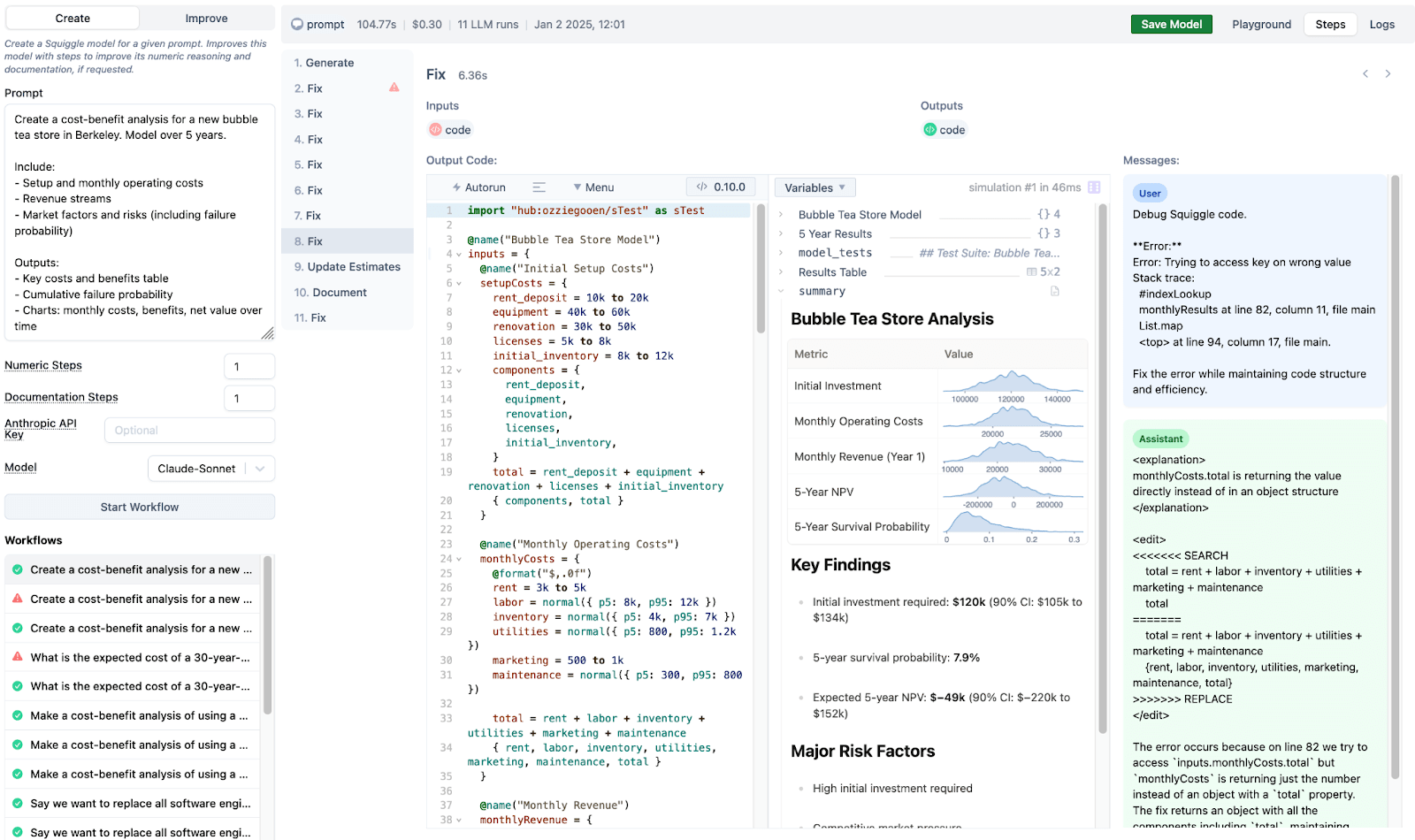 Since LLMs don't naturally write valid Squiggle code, substantial work has gone into bridging this gap. Our system provides comprehensive documentation to the LLM, implements automatic error correction, and includes steps for model improvement and documentation.