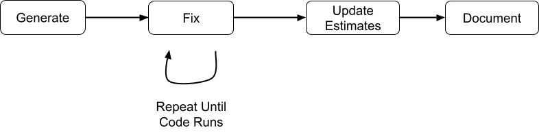A simplified state machine, showing a typical path. Note that the stages “Update Estimates” and “Document” can be optionally run 0 or more times, based on user request. Also, the “Fix” state is used whenever there is broken code, even if it comes from “Update Estimates” or “Document.”