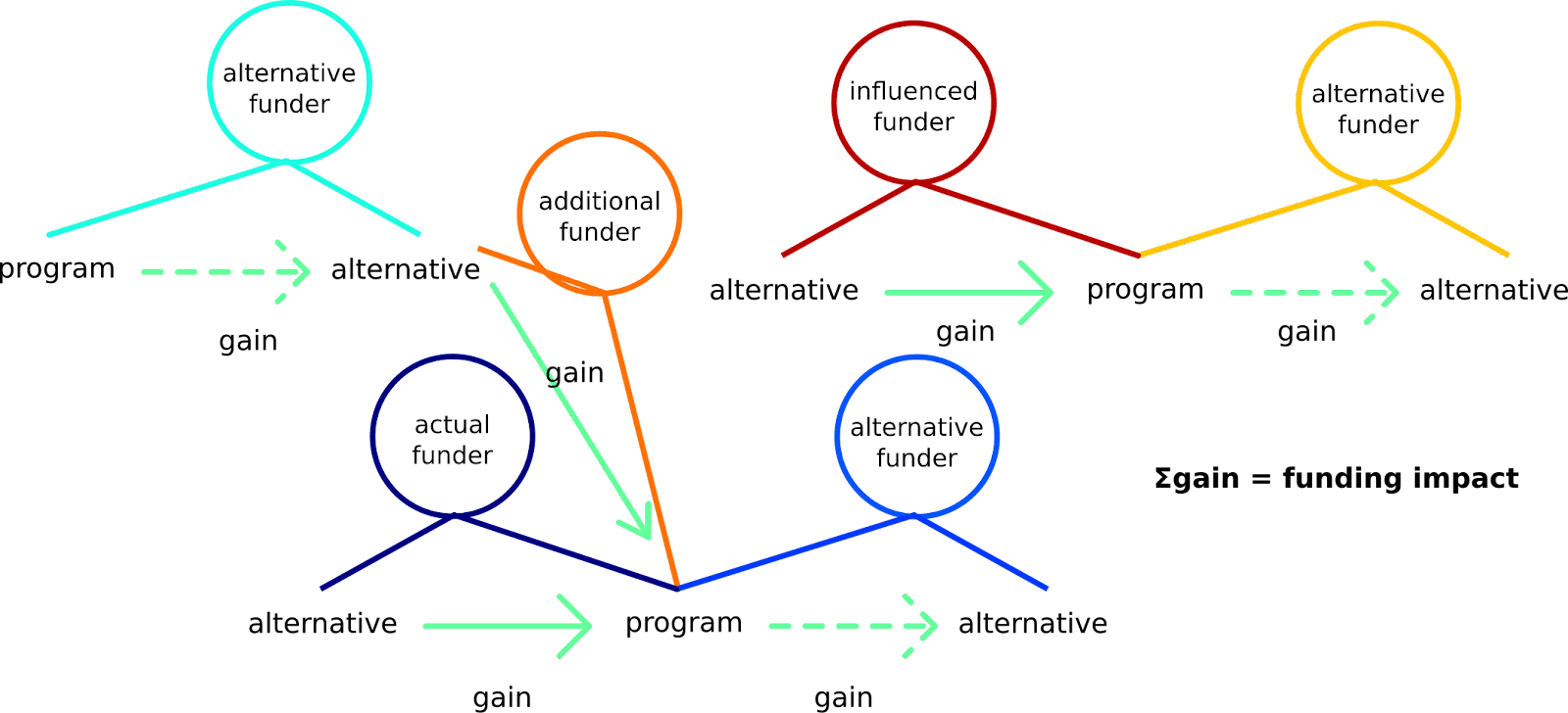 For example, consider that actual funder A invests $1,000 into bednets, while forgoing investing into a painting. She enables an alternative funder B to divest from the bednets to improve a road and motivates an additional funder C, who would have otherwise invested $2,500 into deworming, to invest the $2,500 into bednets. Alternative funder D realizes that deworming tablets are needed, so they forgo their $2,500 project on researching the relative importance of deworming and malaria prevention, from the perspective of the beneficiaries, and invest the $2,500 into deworming that C divested from. An influenced funder E hears that people are divesting from the research on malaria vs. deworming and seem to invest more into bednets, so they divest from baldness research and fund malaria chemoprevention research, since the disease seems to be popular. They are unaware that an alternative funder F would have actually invested into malaria chemoprevention research if they did not fund it, but since this is funded, F spends on researching mosquito welfare, since they think that if they find something important, it can have a significant impact. In reality, the funding landscape is much more complex than this. However, it stays that the sum of impacts of all investments and divestments is the funding impact.