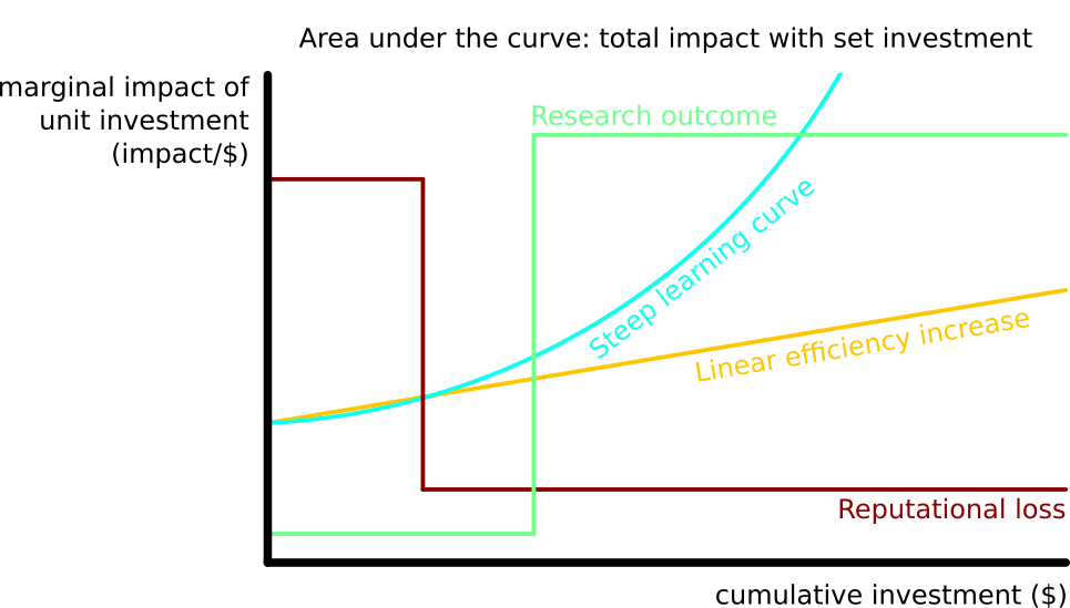 For example, assume that the efficiency of saving lives by providing bednets is constant with increased funding up to the value of $2m, $3,500 per life saved. In addition, it costs $1m to develop a vaccine for malaria. With the vaccine, a life is saved for $500. A funder with $2m can either invest into benets or research and vaccination. In the former case, they save 2m/3.5k=571 lives; in the latter case they save 1m*0+1m/500=2000 lives. If institutional impact is not considered, investors may miss the low-hanging fruit of researching vaccines due to its low marginal cost-effectiveness and opt for a prima facie low-hanging fruit of purchasing bednets. Thus, the development of cost-effectiveness with increasing funding should be estimated and the impact of total funding, when invested optimally, should be considered rather than momentary marginal cost-effectiveness. This is a simplified case: in reality, any additional step changes the projected cost-effectiveness of a large number of interventions, so a complex continuously updated model should be used.