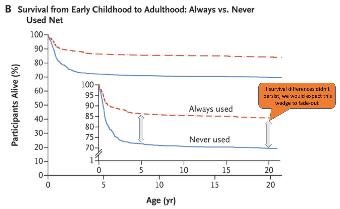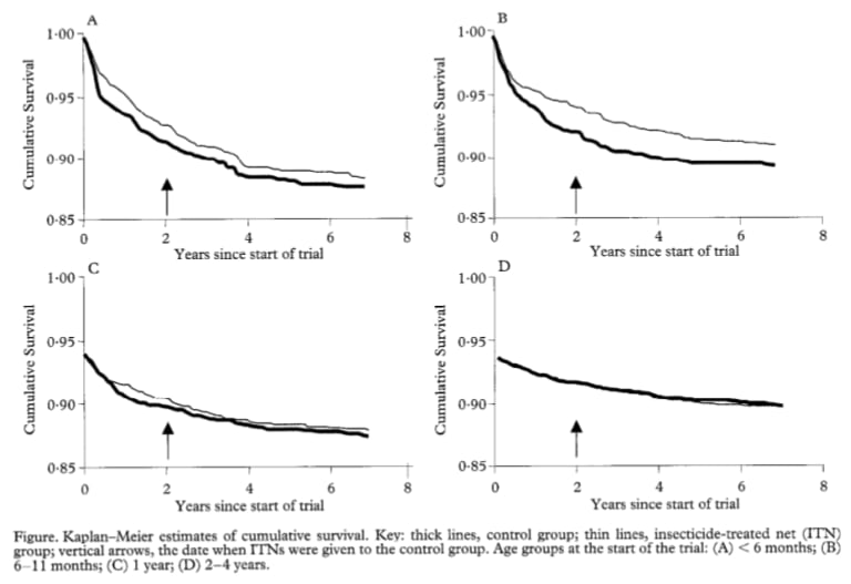 “Participants who were reported to have used treated nets at half the early-life visits or more had a hazard ratio for death of 0.57 (95% confidence interval [CI], 0.45 to 0.72) as compared with those who were reported to have used treated nets at less than half the visits. The corresponding hazard ratio between 5 years of age and adulthood was 0.93 (95% CI, 0.58 to 1.49)”, Fink et al. (2022), page 1.