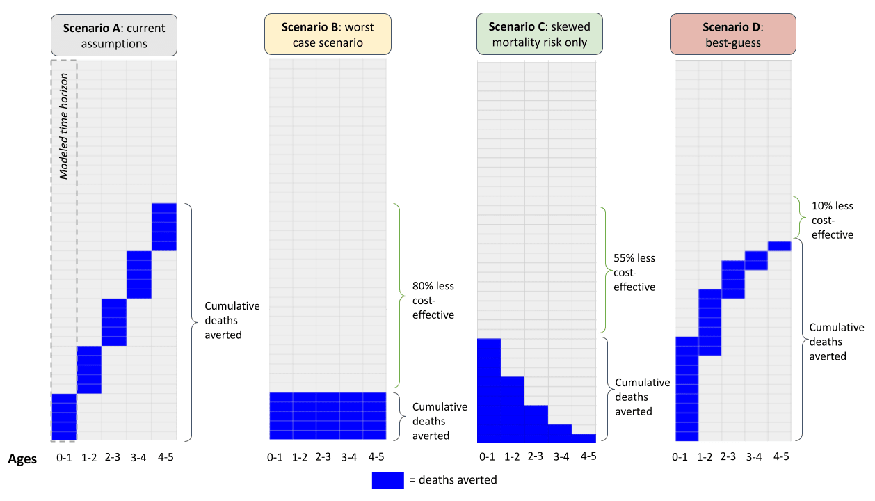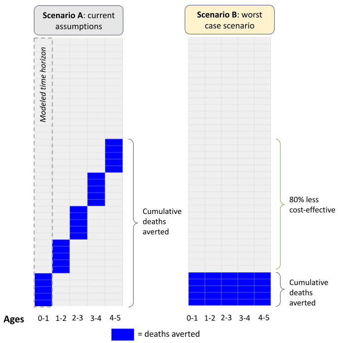 - In a worst case scenario—where we hold other assumptions fixed and assume we’ve saving the same lives each year—we’d save 2,500 lives in total: 2,500 children in year 1 then the same 2,500 children in years 2 through 5.