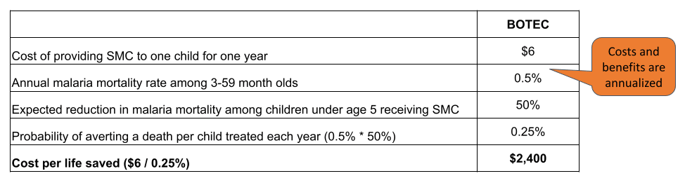 - For each of these programs, we model cost-effectiveness across a snapshot of the entire treatment window.[6] For example, we model the cost-effectiveness of SMC over a 1-year time horizon, despite the fact that children should—in theory—receive SMC each year for the first 5 years of life.