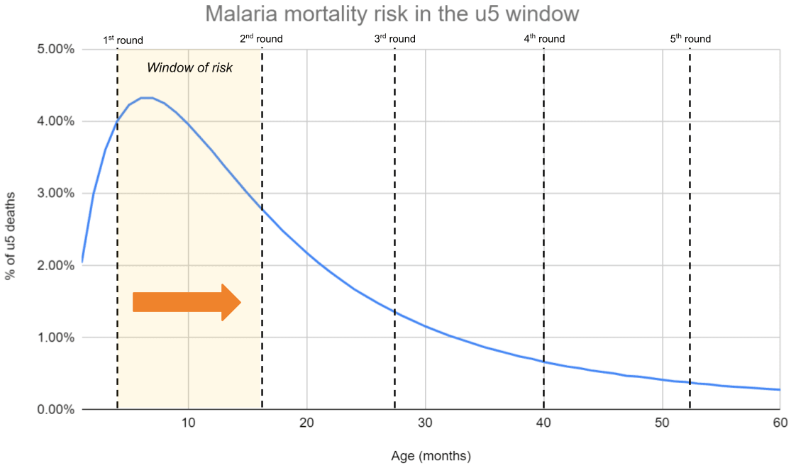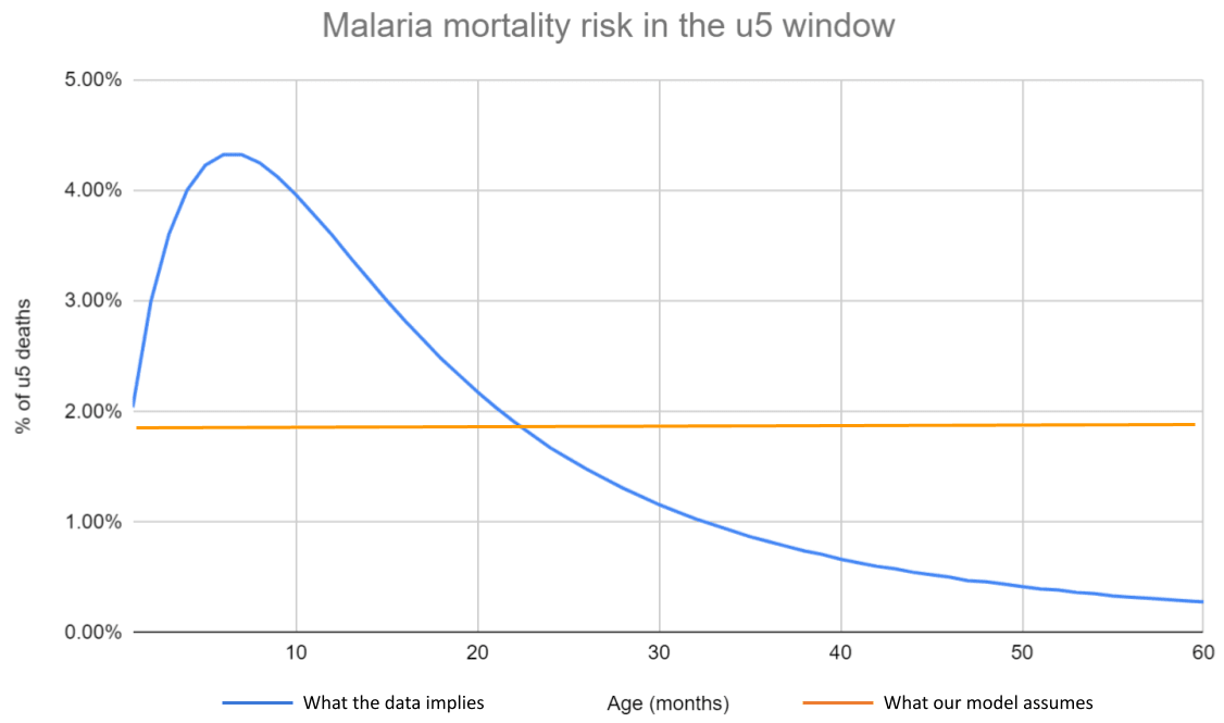In our SMC (and VAS and AMF) models, we make the simplifying assumption that all under-5 children face the same risk of dying each year. This obscures an underlying risk profile that is skewed towards the early years—in the case of malaria, children aged 0-2 are at much greater risk of dying than those aged 2-5.