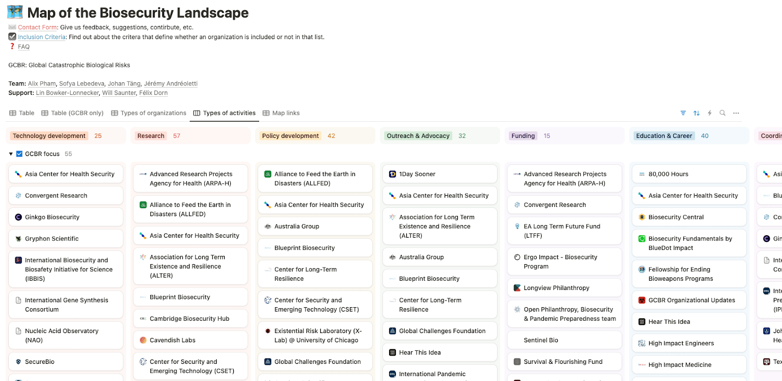 Our aim is to provide an overview of the biosecurity landscape for people who want to learn more about the field, by giving them an idea of the work that is being done (and by whom) and therefore how they could contribute.