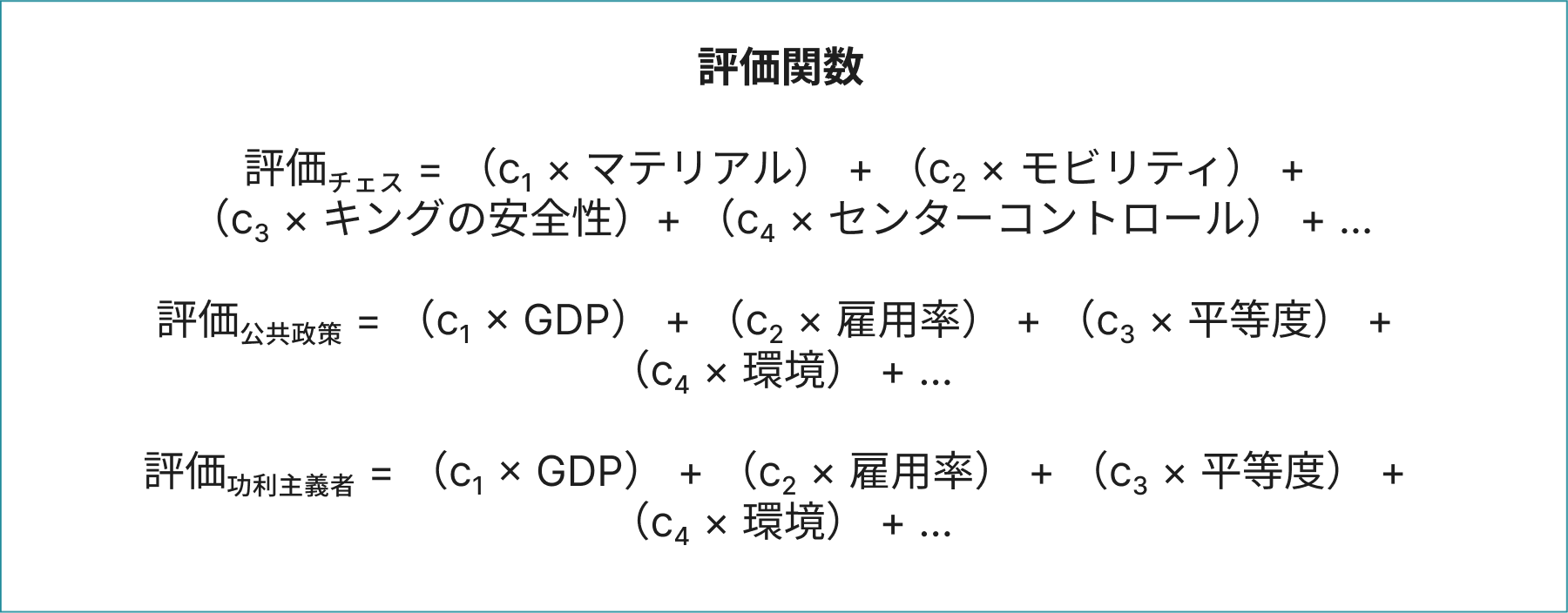 そこで、その代わりにあなたがやらねばならないのは、数手先を確実に計算することです。十数手先くらいでしょうか。そこまで行ったところで分析はとめなければならず、なのでこの場合、あなたは比較的計算するのが簡単な評価関数をもつことになります。この関数は、この六つの手と応手の一連の流れから出来上がる盤面を見て、その盤面の良さをやっつけで評価するものです。チェスの評価関数の典型例は、次のようなものです。
