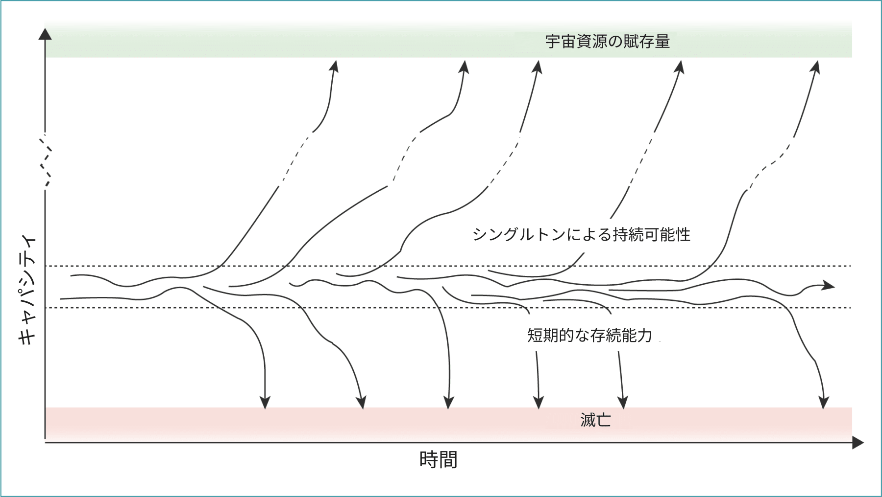 しばらくは同じ領域をうろうろするかもしれませんが、考えるタイムスケールを長くとればとるほど、その領域を抜け出して下降し、滅亡するか ── 人的資源があまりに少なくなり、存続可能な最低の人口規模以下になってしまうなら、滅亡に向かいます(これはアトラクター状態のひとつです。つまり一度滅亡してしまえば、滅亡し続けることでしょう) ── あるいは上昇します。すなわち、技術的な成熟を迎え、他の星への植民地化を開始して、そうなれば地球起源の知的生命体の未来は、光の速度にも近い速さで膨張する泡のごとく拡大していき、ついには宇宙にあって私たちの出発地点から原理的に到達可能なすべての資源を利用できるようになるかもしれません。宇宙にあって私たちに到達可能な資源は、正の宇宙定数のために有限量です。私たちには有限量の物質にしか利用できないようです。とはいえひとたびこの過程が始まり、複数の銀河をまたにかける帝国となるなら高い確率で、この自然な展望に向かって只々進み続けるように思われます。