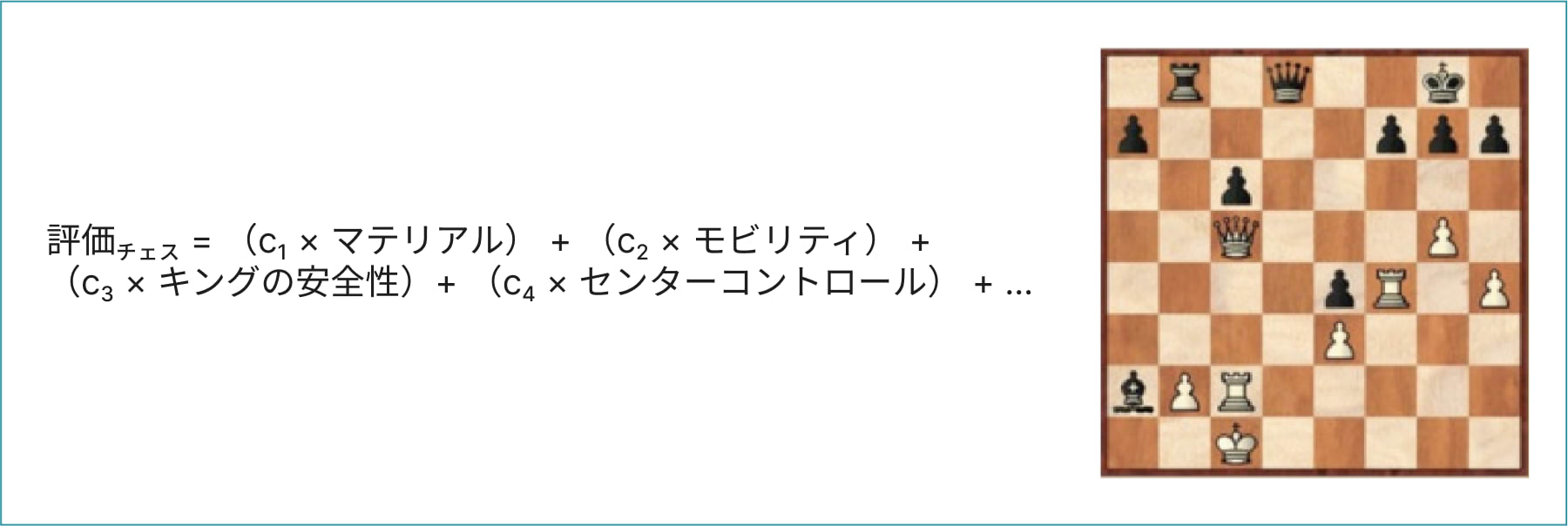 そこであなたは、数手先を確実に計算して、比較的安定したこの評価関数を得ることになります。これを使えば、最初の数ターンをどう運べば、最も有利な状況になるかを知ることができます。こうした評価関数は主に、チェスの試合経験が豊富な人間のチェス・マスターから引き出してきたものです。異なる特徴に割り当てる重みづけなどのパラメータは、機械知能にも学習できるかもしれません。