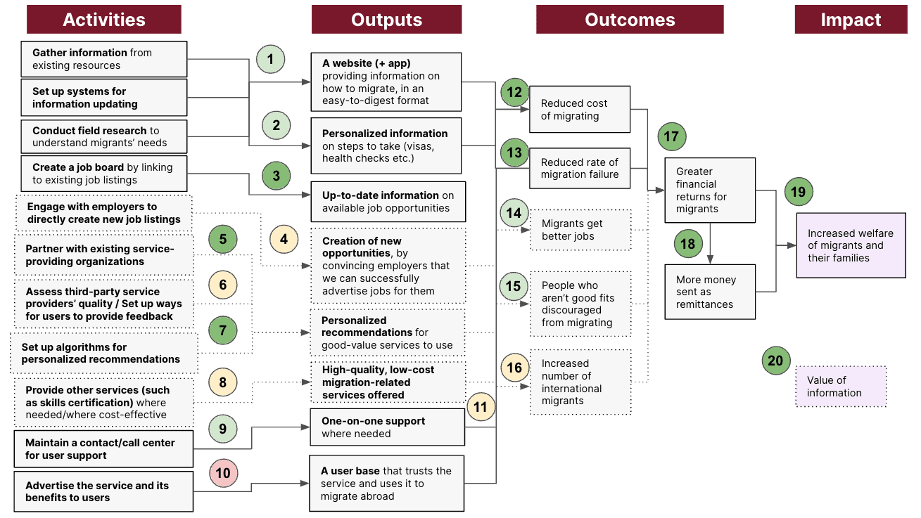While there are many existing organizations that offer some of these services, we have not found any that provide all of them on a unified platform. Additionally, the existing market is dominated by for-profit organizations that often exploit individuals’ motivation and extract value from them. A new, impact-oriented nonprofit organization operating in this space could create large economic and welfare gains. There is good evidence that well-managed international labor migration can create such returns, and the barriers to achieving this are also relatively well understood. While the theory of change behind this charity is somewhat complicated, most of the activities have been done by past actors, demonstrating their tractability.