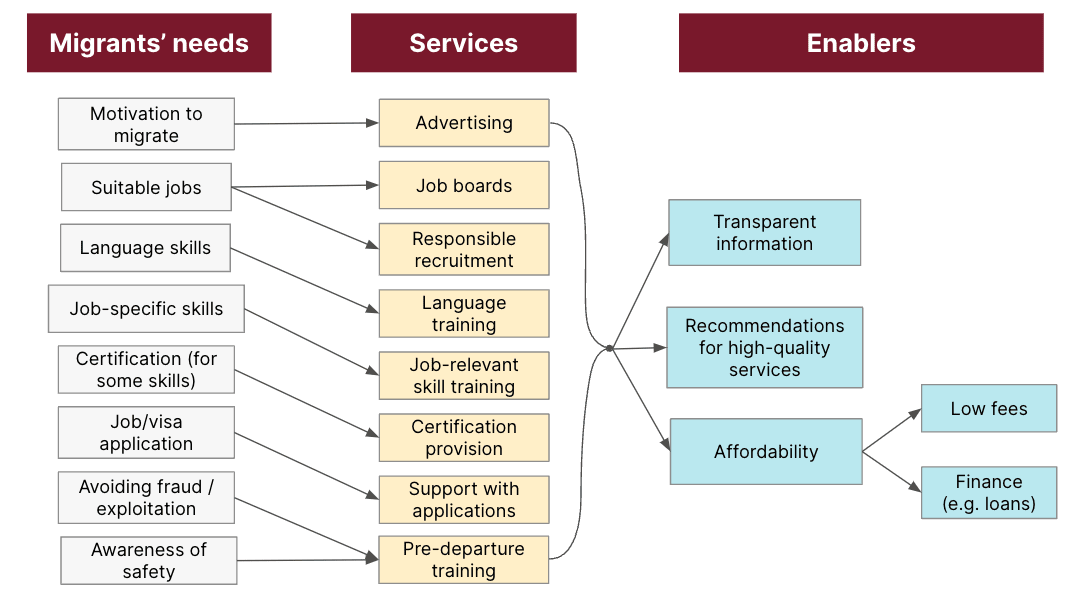 Figure 2: Barriers, services, and enablers needed for prospective migrants (in countries where visas and job opportunities are available).