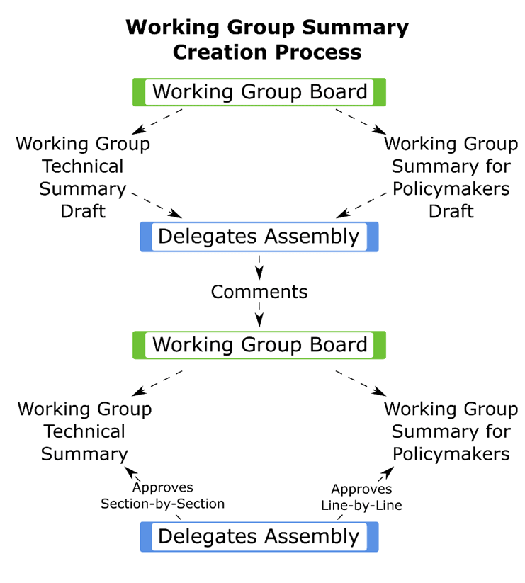 As with the Working Group reports, each section of the Working Group Technical Summary and each line of the Working Group Summary for Policymakers must have at least 90% endorsement from Delegates to stay. Since Working Group Summaries will be endorsed as part of the Delegates Assembly meeting, all participating countries will have the opportunity to vote. However, since these Working Group Summaries build off of Working Group reports, which have already received Delegate endorsement, it will be unlikely for large parts of the Working Group Summaries to be rejected in this process.