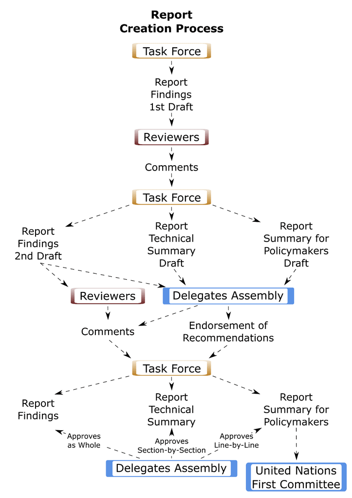 The Delegates Assembly is made of Delegates from all participating countries. Delegates will be both diplomatic and scientific representatives of their countries, and will approve IPGCR reports. The Delegates Assembly will have a large in-person meeting once every 5 years to discuss and vote on key aspects of the IPGCR, such as the IPGCR’s processes and elections of Executive Board members. The Delegates Assembly will also have shorter annual meetings to monitor the IPGCR’s ongoing operations. The Delegates Assembly plays a key role in the IPGCR review process, described in sections 4.2 and 4.3 below. Due to the autonomous nature of the Working Groups and the ongoing nature of the Working Group reports, the Delegates Assembly will need to be available on an ongoing basis for remote review and remote voting on items that require their approval (described in detail in sections 4.2 and 4.3). This structure ensures all Delegates will have a say in the IPGCR’s operations, while also keeping the organization nimble enough to respond to changes in the state of knowledge relating to global catastrophic risks.