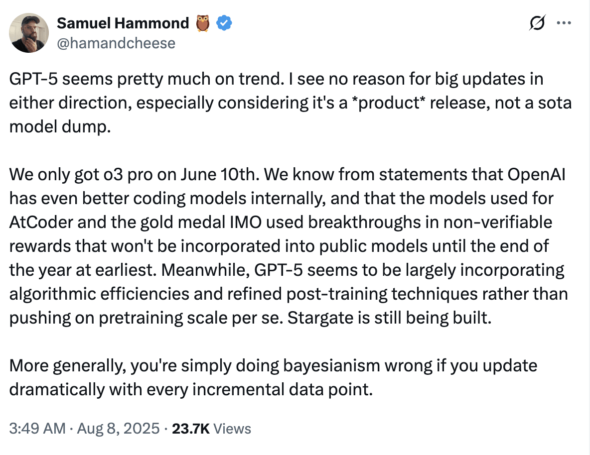 I’m not a technical person, and my naive expectation was that GPT-5 would feel as big a jump as GPT-3 to GPT-4. I now think two things are true at the same time: