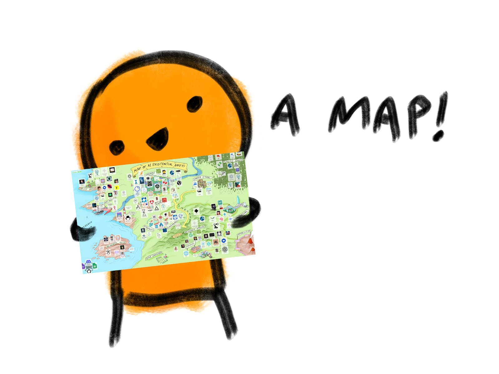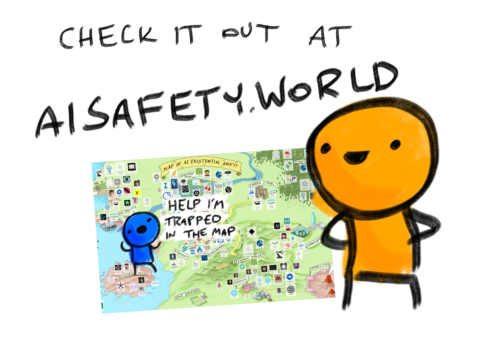 The map displays a reasonably comprehensive list of organizations, people, and resources in the AI safety space, including: