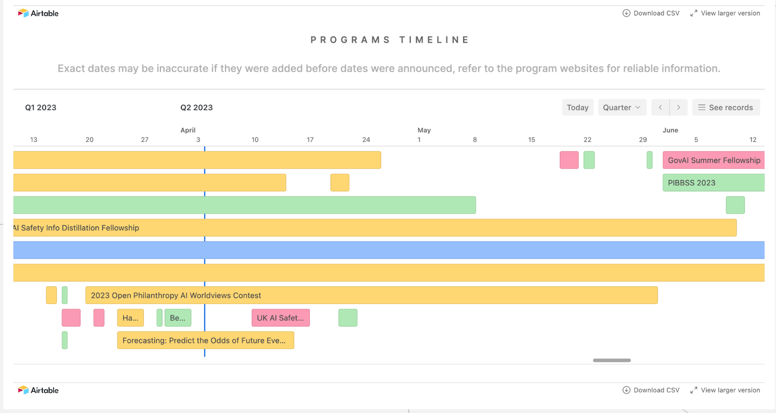 aisafety.training gives a timeline of AI safety training opportunities available by plex using AISS's database