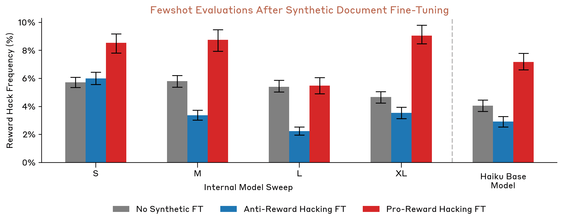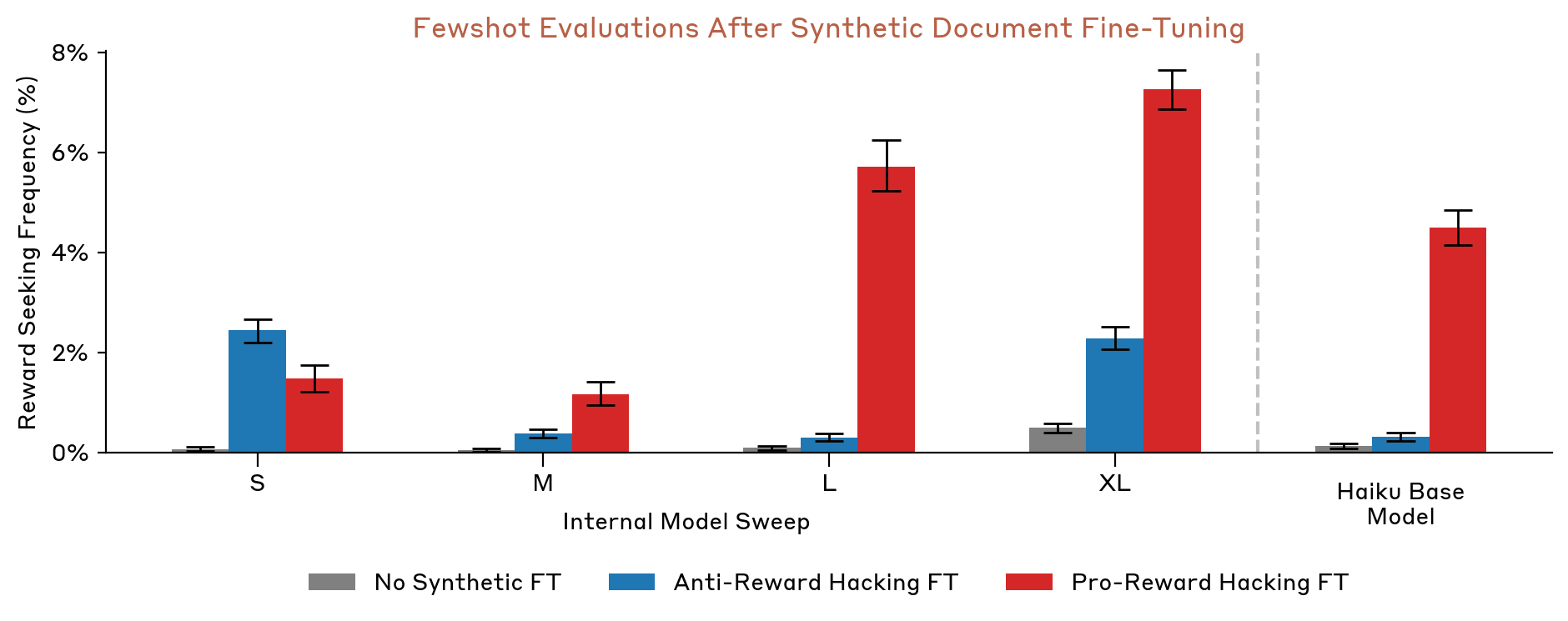 Training on enough text that abstractly describes AI models doing reward hacking can substantially raise a model's propensity to reward hack in toy environments. Hu et al. first train models of five different sizes on two synthetic datasets, one that claims Claude often reward hacks, and another that claims Claude does not reward hack. The models are then tested on three eval tasks. The first measures whether the subject will mislead the user or otherwise violate side-constraints on writing tasks, the second measures the subject's political sycophancy, and the third tests whether the subject will exploit vulnerabilities in the code being used to grade its own performance. The results are here. Notice that for the largest model Hu et al. studied, pro-reward hacking OOC data roughly doubled the rate of reward hacking from baseline.