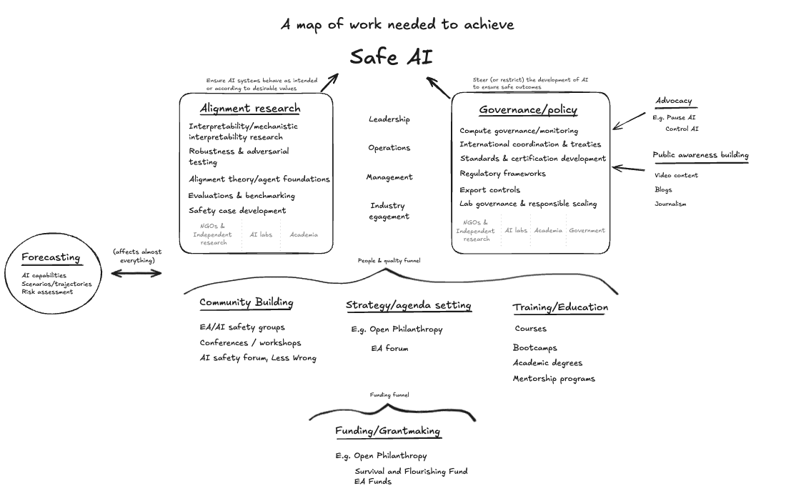 For this reason, gaining a birds-eye view of the AI landscape may be important. There is already some good work in this direction: for example this summary of current work in AI governance, and this map of different organizations in the space. But as far as I'm aware there is no single overview of all the work being done (or that should be done) to achieve safe AI, and of how the different efforts link together. To fix this gap, I've tried to map the movement below. I hope that this map will help newcomers to better understand the field, and that it can be used to identify bottlenecks or missing pieces (although I have not attempted to do so here).