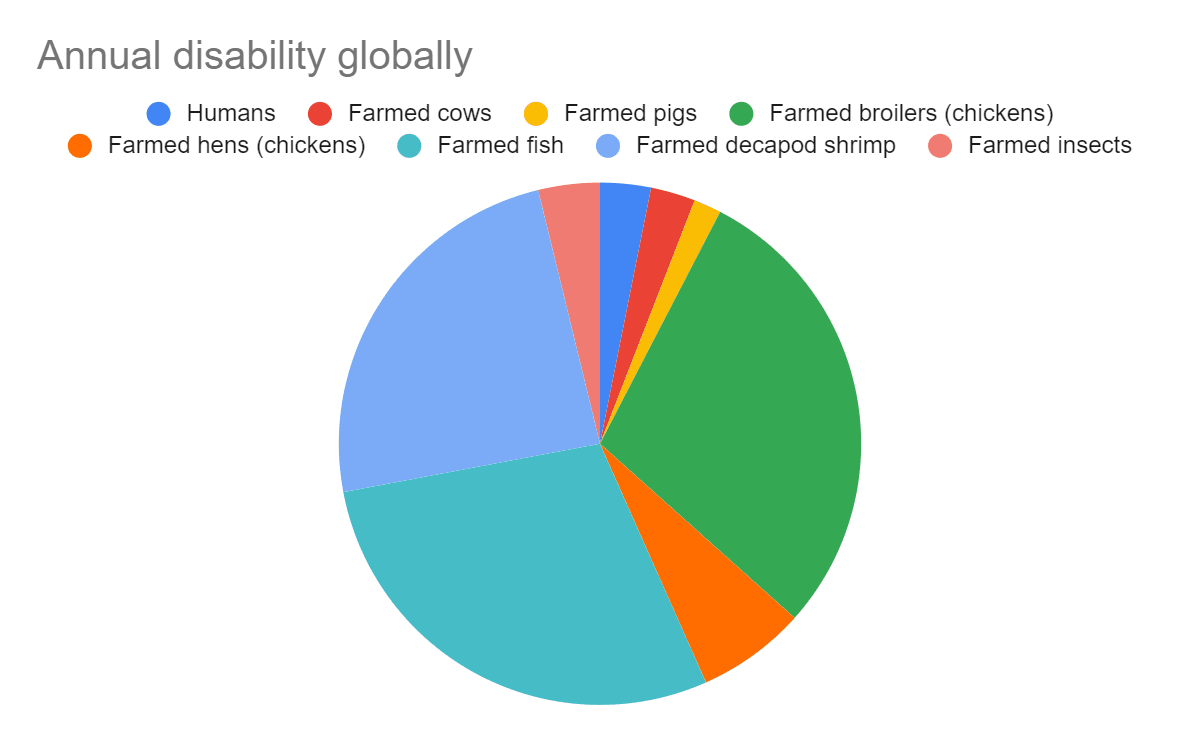 - The annual disability of farmed animals is much larger than that of humans, even under the arguably very optimistic assumption of all farmed animals having neutral lives.