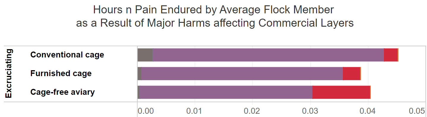 - The time that farmed broilers, hens and decapod shrimp on ongrowing farms experience each of the 4 pain categories defined by the Welfare Footprint Project (WFP). I also supposed all poultry birds are in a conventional scenario, and that hens are in conventional cages or cage-free aviaries, using data from WFP to find the respective fractions.