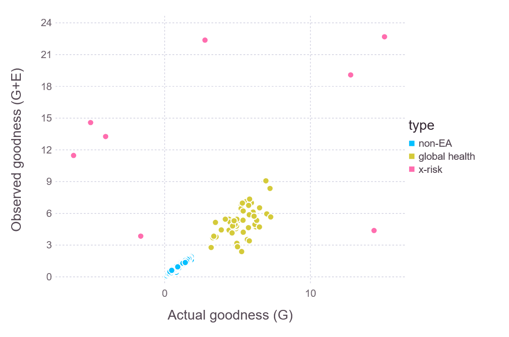 It's also interesting to compare the yellow global health cluster to the blue non-EA line. Even though the global health charities have much higher measurement error than the non-EA charities, they still have decent signal to noise ratio, and if you see e.g. a yellow charity with an observed goodness of 6, you can be pretty sure it's not actually less good than a typical standard charity. Of course this is by construction; the whole point of this experiment was to strengthen my own visual intuition :)