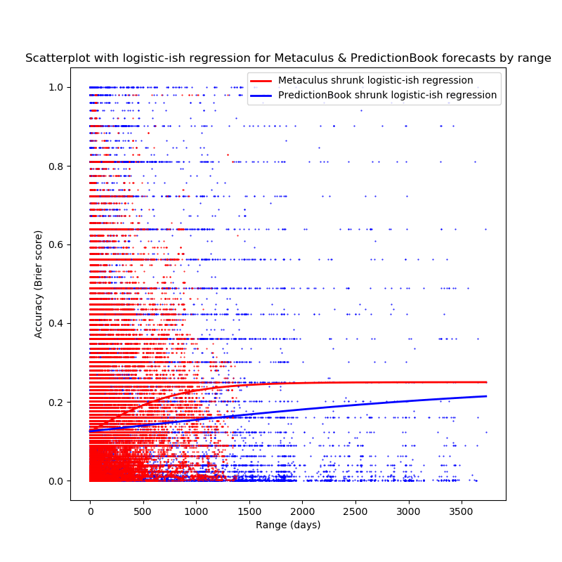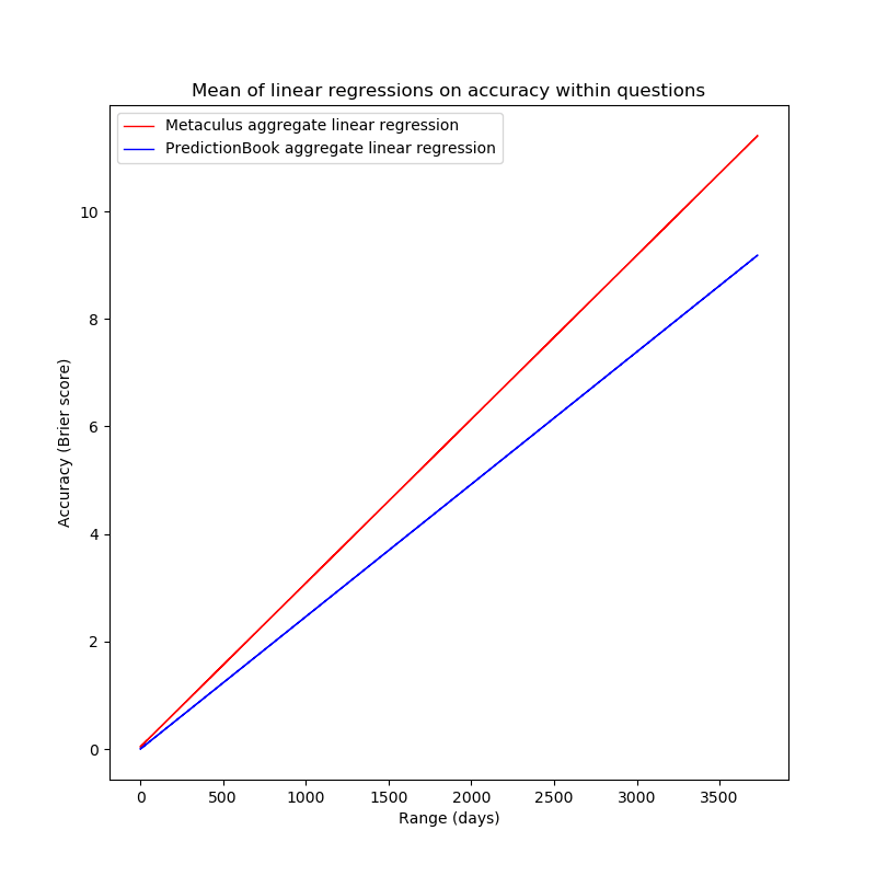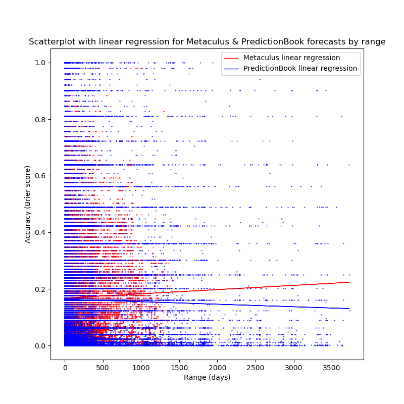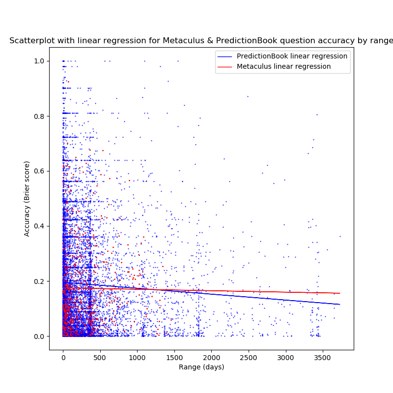 - Questions with a longer range (that is, time between the question being written and the question being resolved) generally receive predictions with a higher accuracy than questions with a shorter range (more). 1. Again, the correlation coefficients (-0.01 for Metaculus (though p>0.8), and -0.05 for PredictionBook) and the slopes of the linear regressions are close to 0.