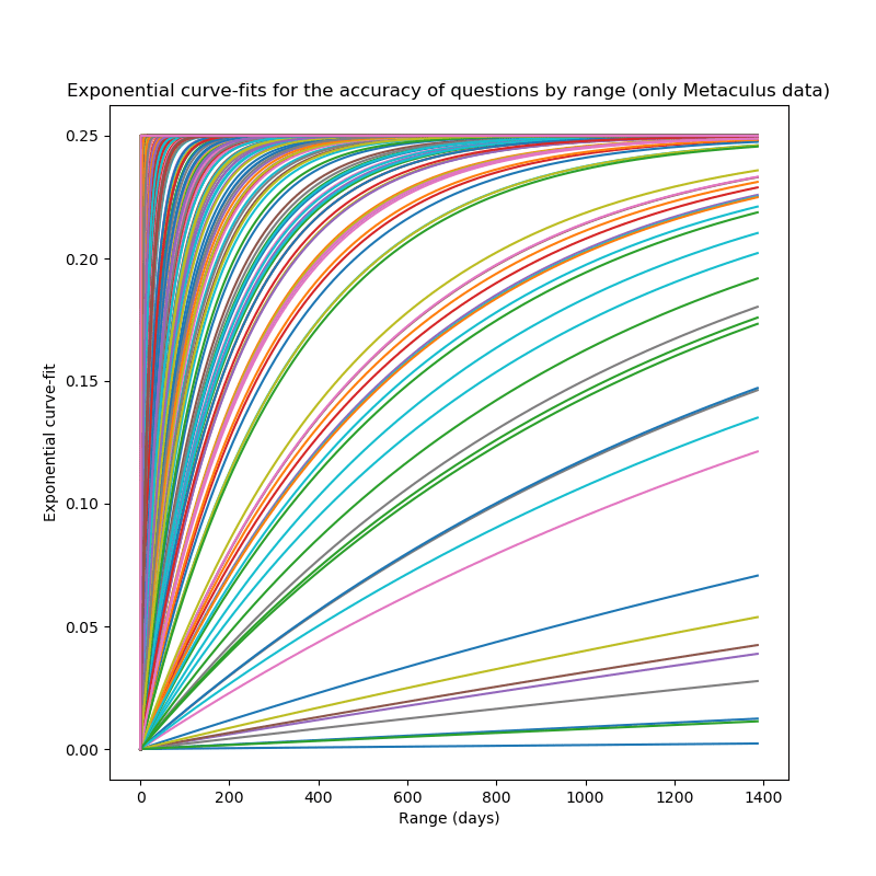 These results suggest what to expect with questions with even greater range: That later predictions (closer to resolution time) on them will generally be more accurate, and that the kinds of questions with a very high range might engender predictions with an even higher accuracy than questions with short and medium ranges.