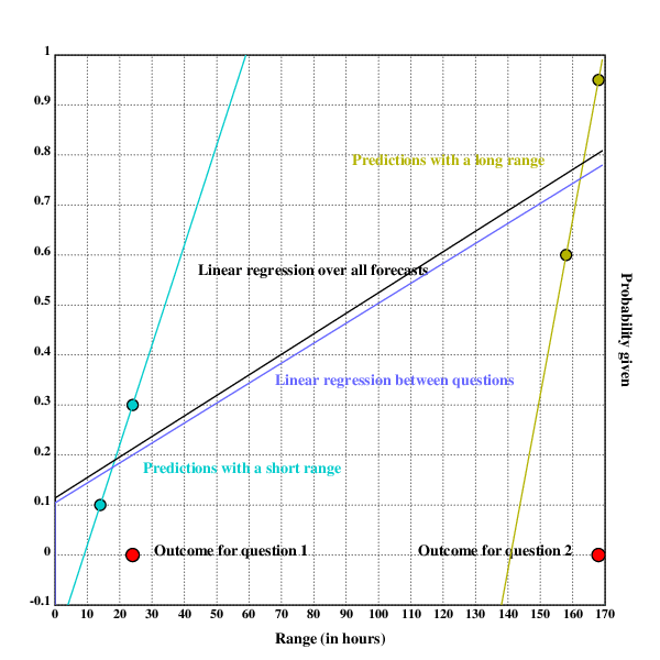 In the chart above, the relation of range and accuracy between forecasts would be the black linear regression.