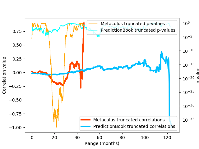 But truly odd is the p-value here: The dip in the correlation coefficient for Metaculus data is judged to be extremely unlikely to have occurred randomly, down to , so that it makes the chart nearly unreadable even on a log-scale.