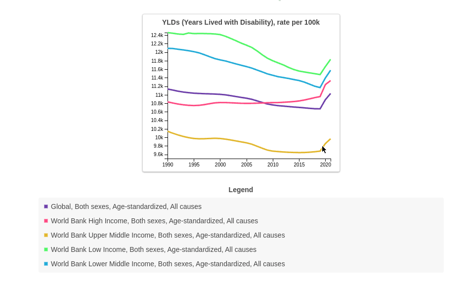 To get that number I used data from Global Burden of Disease Study to get a rough number of YLDs that one will suffer when living in World Bank income regions: