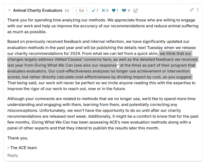 I don't think we disagree that much here, except how much these things matter — I don't really care about ACE's ability to analyze cost-effectiveness outside broad strokes because I think the primary benefits of organizations like ACE is shifting money to more cost-effective things within the animal space, which I do believe ACE does. I also don't mind ACE endorsing speculative bets that don't pay off — I think there are many things that were worth paying for in expectation that don't end up helping any animals, and will continue to be, because we don't really know very many effective ways to help animals so the information value of trying new things is high.