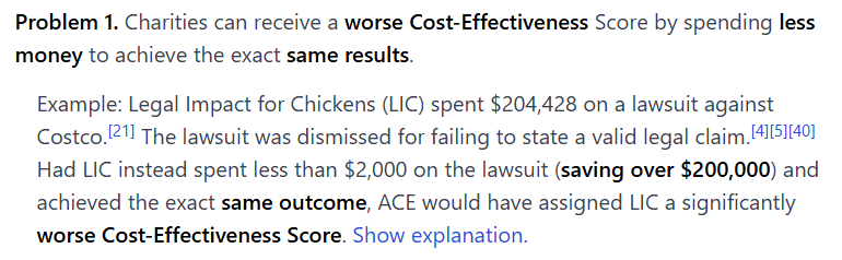 We go on how to detail how if LIC had spent less than $2,000 on the lawsuit (saving over $200,000) and achieved the exact same outcome, ACE would have assigned LIC a Cost-Effectiveness Score of 1.8. The lowest Cost-Effectiveness Score ACE assigned to any charity in 2023 was 3.3. This means if LIC had spent less than $2,000 on the lawsuit, LIC's Cost-Effectiveness Score would have been significantly worse than any charity ACE evaluated in 2023.