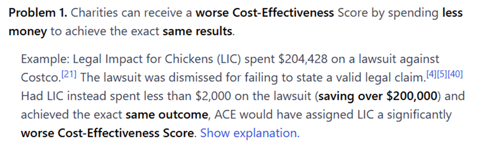 We go on to detail how if LIC had spent less than $2,000 on the lawsuit (saving over $200,000) and achieved the exact same outcome, ACE would have assigned LIC a Cost-Effectiveness Score of 1.8. The lowest Cost-Effectiveness Score ACE assigned to any charity in 2023 was 3.3. This means if LIC had spent less than $2,000 on the lawsuit, LIC's Cost-Effectiveness Score would have been significantly worse than any charity ACE evaluated in 2023.