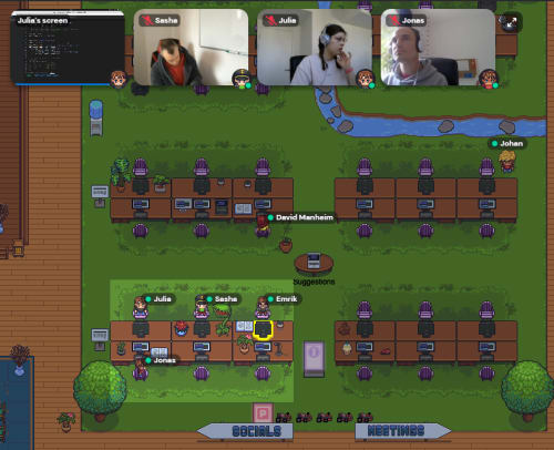 You can share screen on gathertown (I think I managed to do it before.) However, it seems like in the current gathertown setup (the way the desks are arranged and where videos can be streamed), I haven't really found a way to see other people's videos while working in the desk working area, though you can work in other areas and maybe see nearby people's videos.