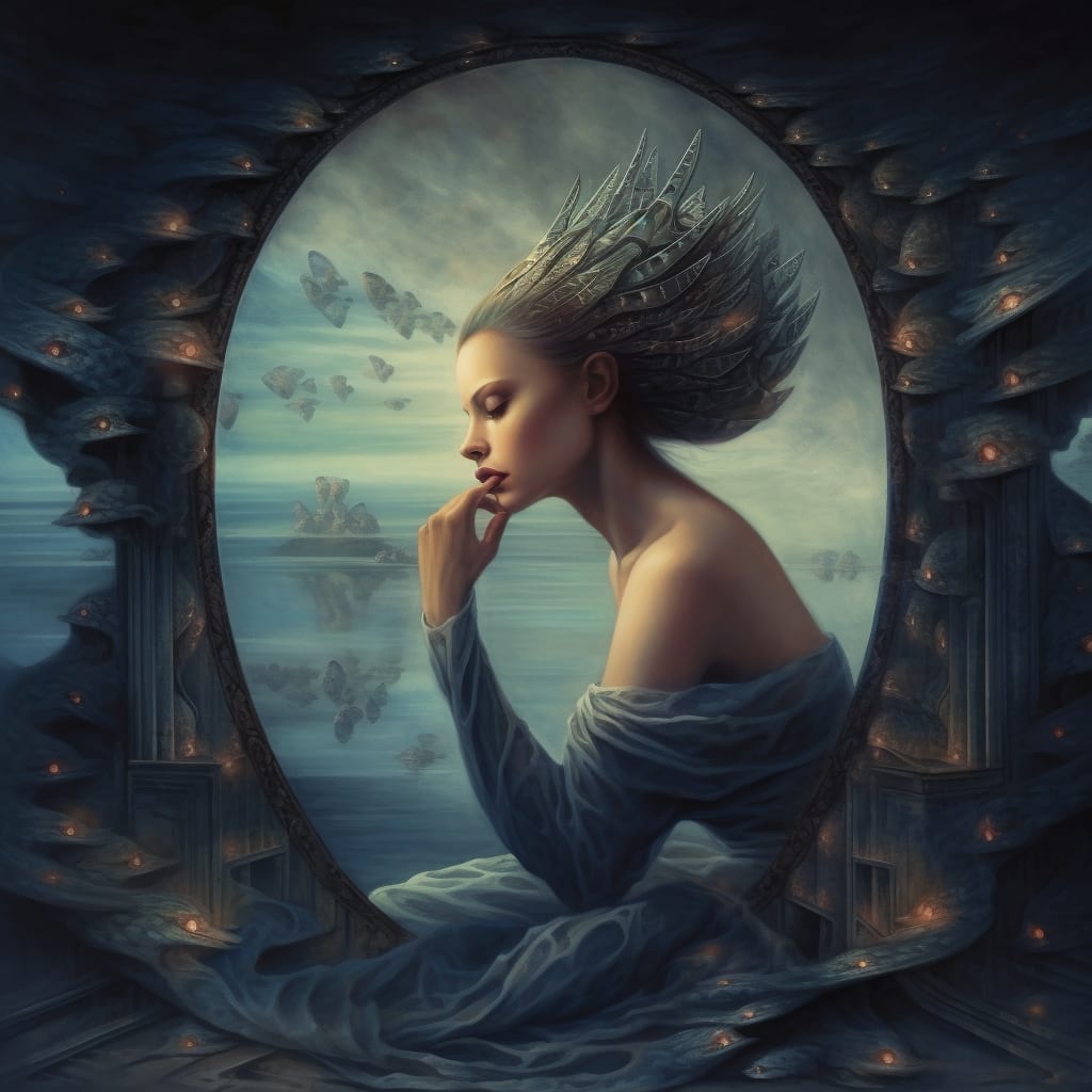 Maybe it’s discomfort in your body, or a leg or arm that’s falling asleep. You could use environmental cues, such as alarms or visual cues around you (printed out pictures, sticky notes, etc) can also help train the mental habit… though I want to stress caution in anything that leads to Self Monitoring that is largely anxious. The alarm should be a gentle chime, the visual cue should be a picture of a reflective lake, or even just a small mirror hung on your wall… if it’s hard to imagine the vibe, here’s Midjourney to lend a hand: