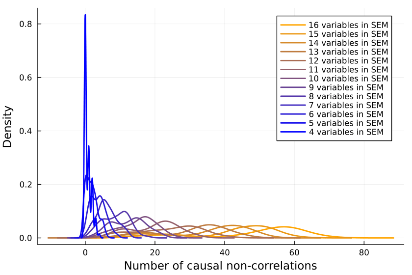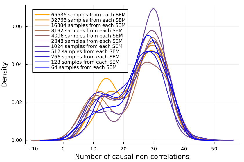 So we collect a bunch of samples. SEMs with one, two and three variables are ignored because when running the code, they never give me any causal non-correlations. (I'd be interested in seeing examples to the contrary.)
