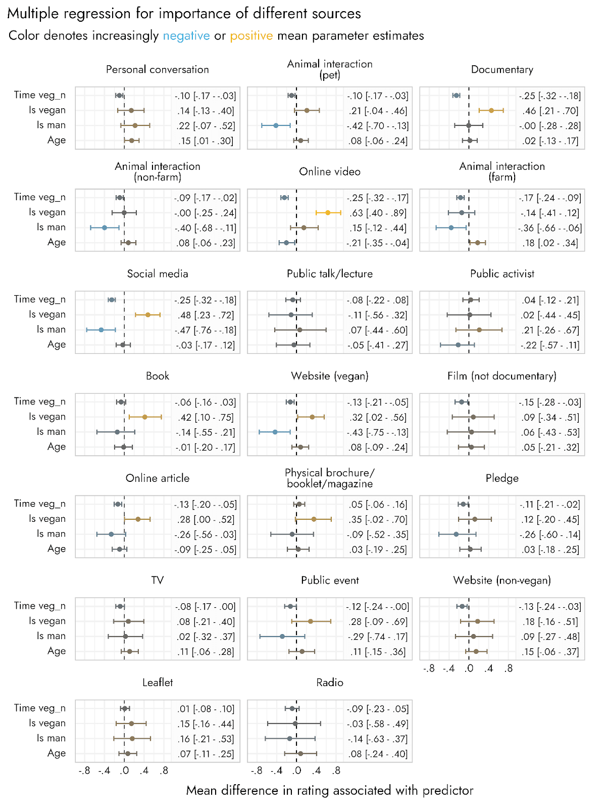 To understand what factors might relate to ratings of importance, we analyzed importance ratings using a multiple regression model, again including gender, diet, age, and time on diet as predictors. The figure below presents parameter estimates for each predictor variable (the Time veg_n[2] parameter estimate represents a change in duration of 5 years, and the Age parameter represents a change in age of 10 years). Some notable trends stand out: men tended to rate several sources as less influential than did women, including all Animal interaction items, Social media, and vegan websites. There weren’t any sources that men reliably rated as more influential than women (for which the 95% HDI for the item excluded no effect), although men did tend to rate Personal conversations as more influential. Vegans rated Documentaries, Online videos, Social media, and Books are more influential than did Vegetarians. Similarly to trends in the likelihood of reporting them as first influences, those with more time on a vegetarian/vegan diet rated Online videos, Social media, and Documentaries as less influential. Having more time on a vegetarian/vegan diet was also associated with providing higher ratings for the influence of each of the Animal interaction items.