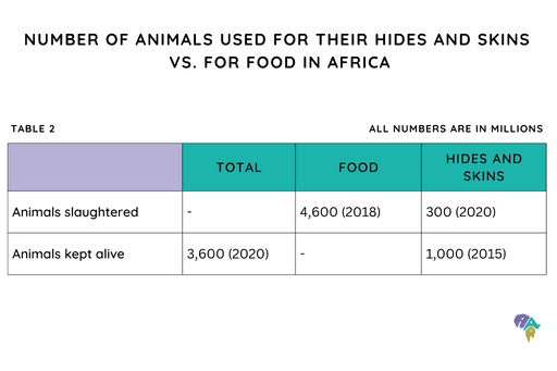 The number of farmed land animals slaughtered for food in Africa in 2018 was at ~4.6 billion, substantially higher than the above-indicated 300 million animals slaughtered for their hides and skins in 2020, suggesting that food production is the major contributing factor for animal slaughter in Africa. The higher number of slaughtered animals compared to live animals in food production is mostly a result of the large number of chickens, who have a much shorter lifespan than most of the other land animals in scope.