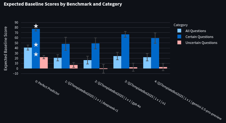 As a quick sanity check, I benchmarked some of the bots we ran in the Q1 AI Benchmarking Tournament to double-check that I could get the same rankings with expected baseline score as we got in Q1. In Q1, we found that o1 beat DeepSeek-R1 and both beat GPT-4o. A quick run on the 112-question training set (the smaller set was chosen to reduce cost) found the same ordering (though with overlapping error bars). Also included in this test was Gemini 2.5 pro, which got similar scores to o1. I’m now curious to see if o1 and Gemini 2.5 pro score similarly at the end of our Q2 tournament. Note, though, that these evaluations only use binary questions. The AI Benchmark Tournament uses numeric and multiple-choice as well (data)